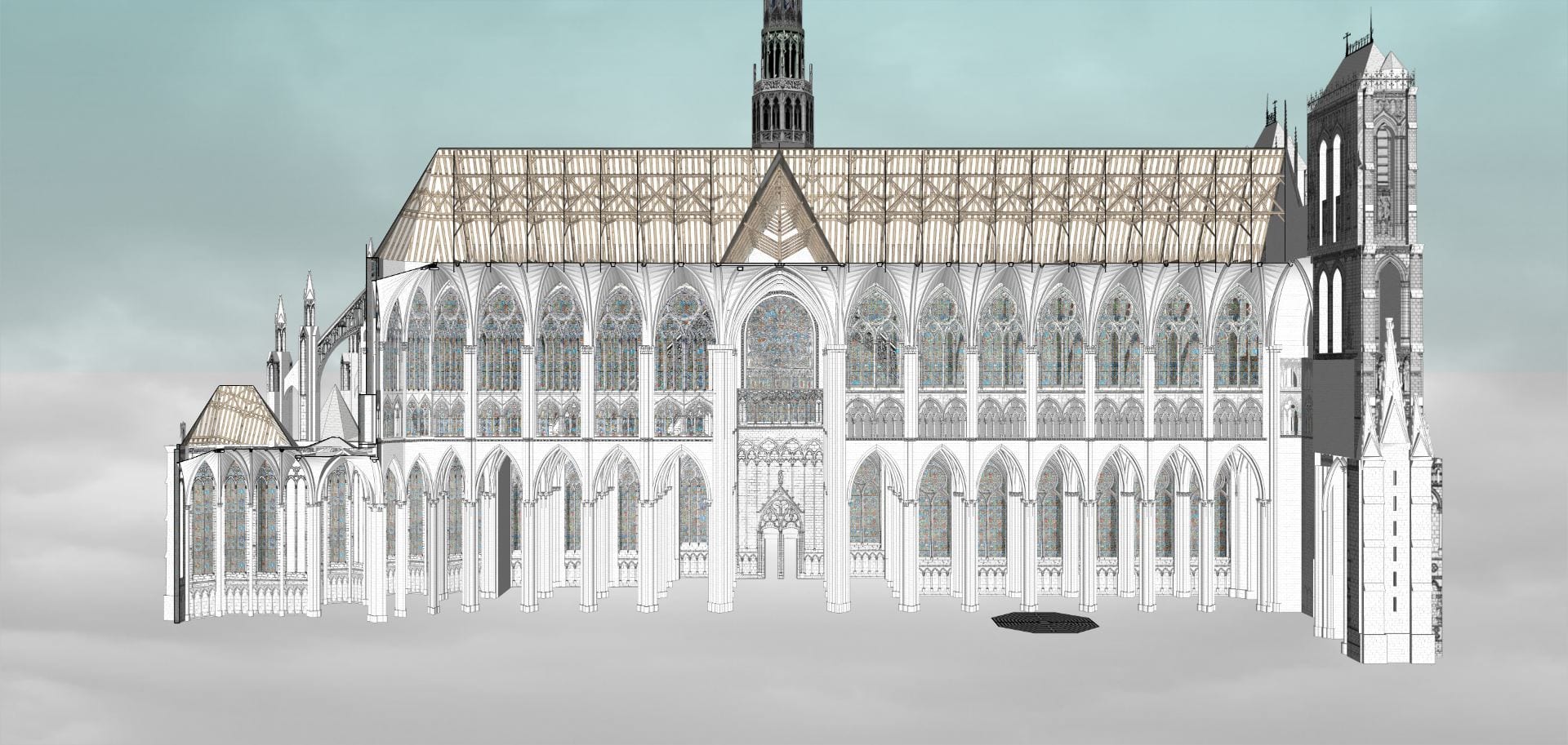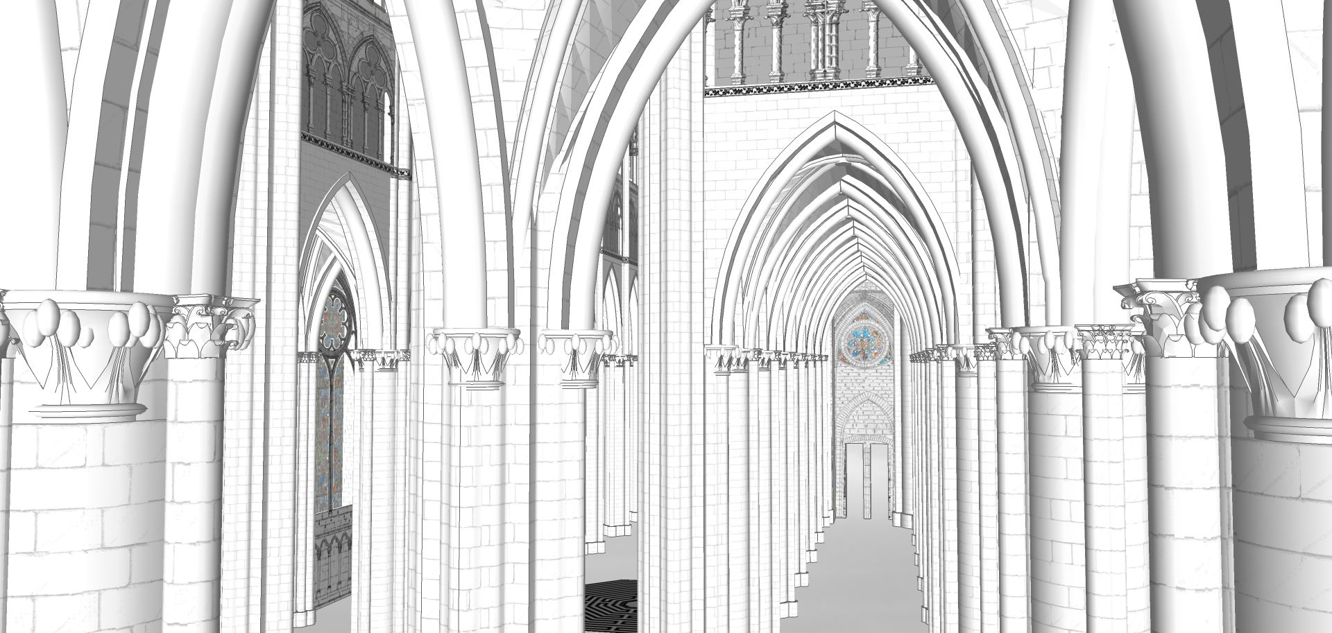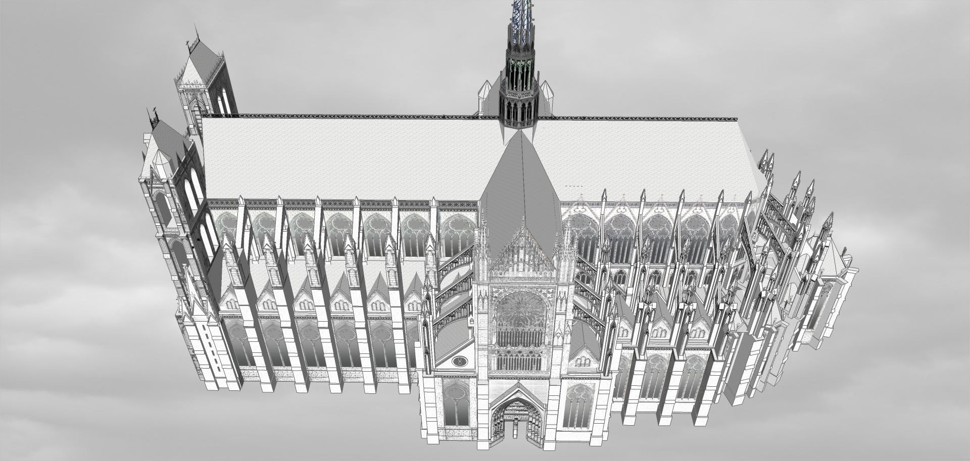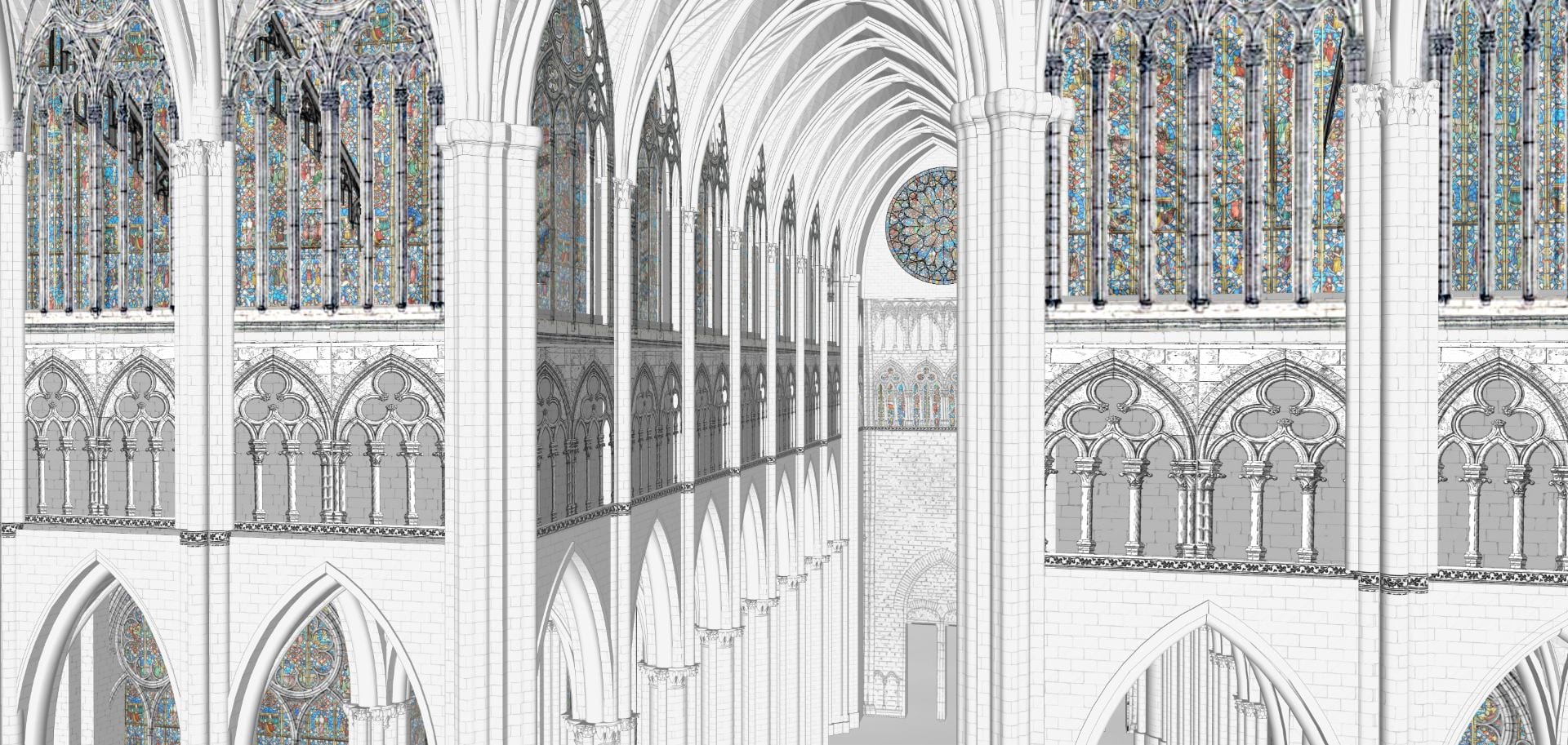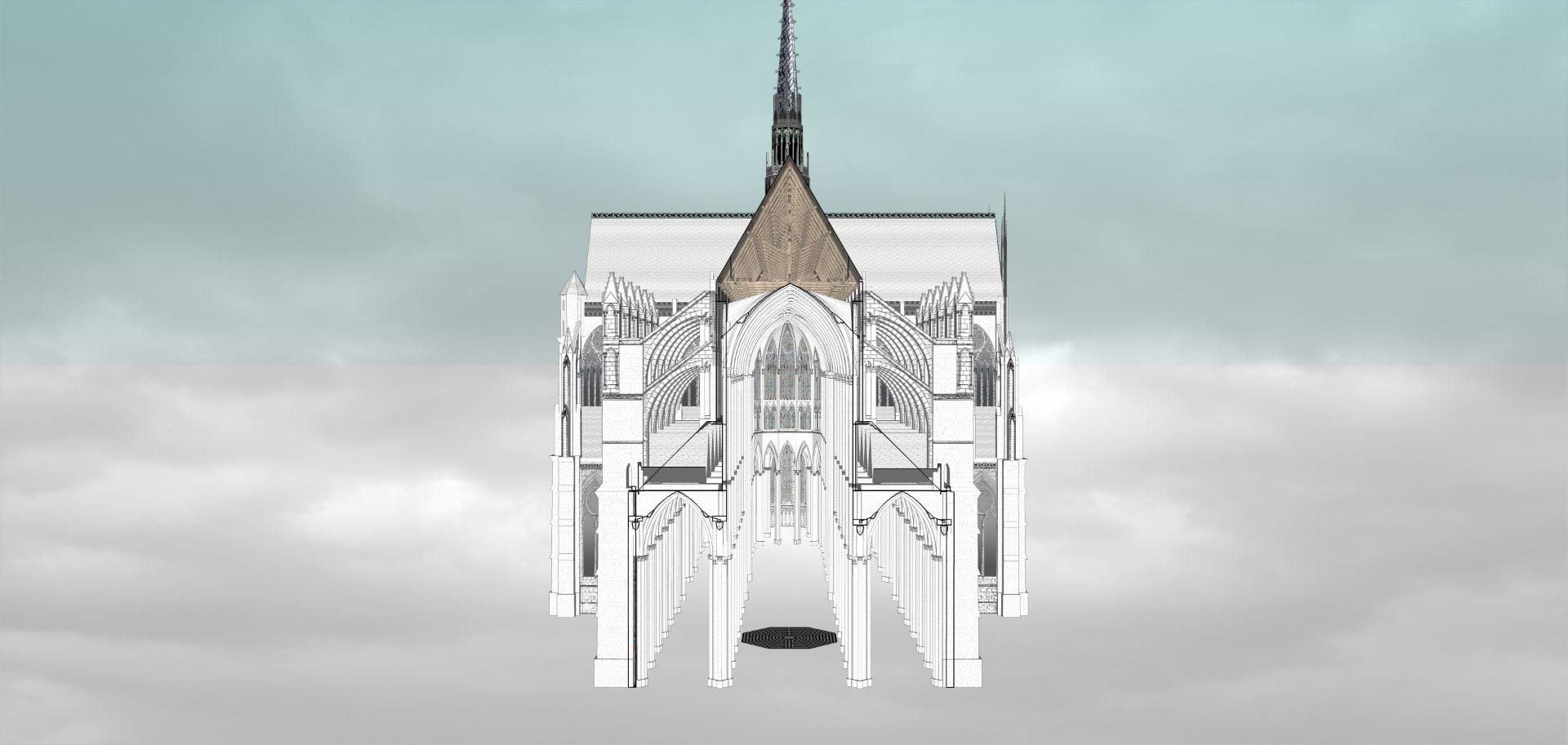 Computer models allow us to explore architecture in ways not possible in reality. With Amiens floating in the sky, one looks up to the grid of vaults and the forest of columns. The cathedral is real, but the views of it are imaginary.