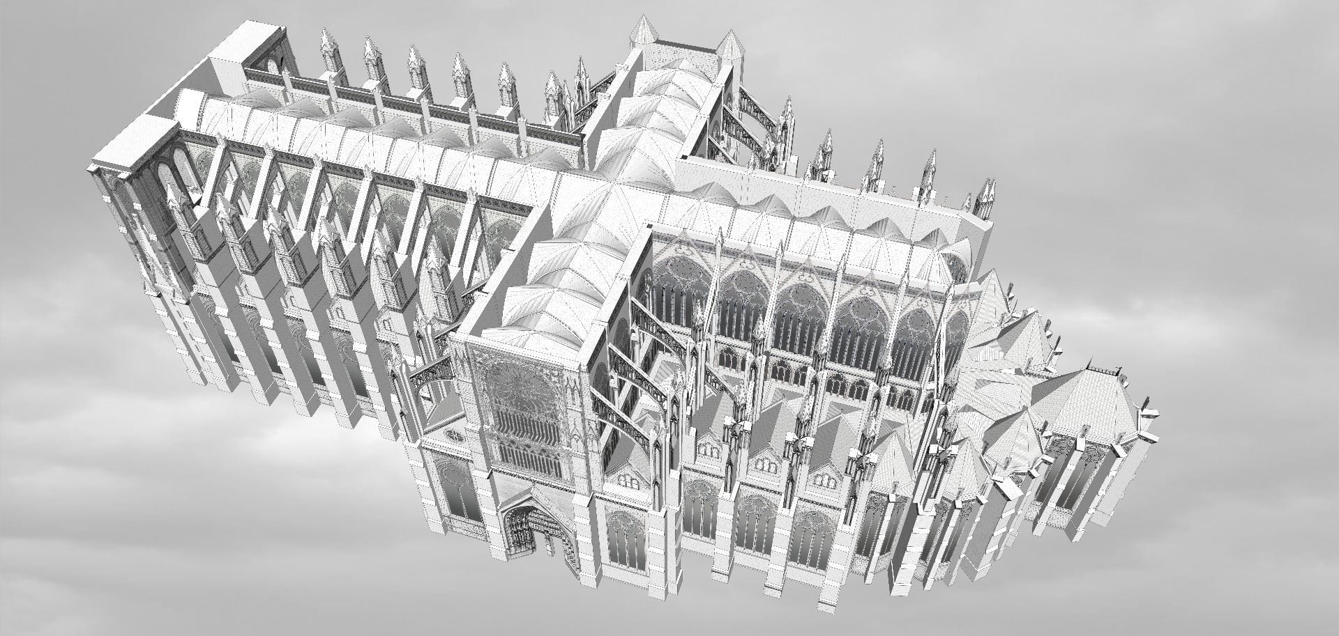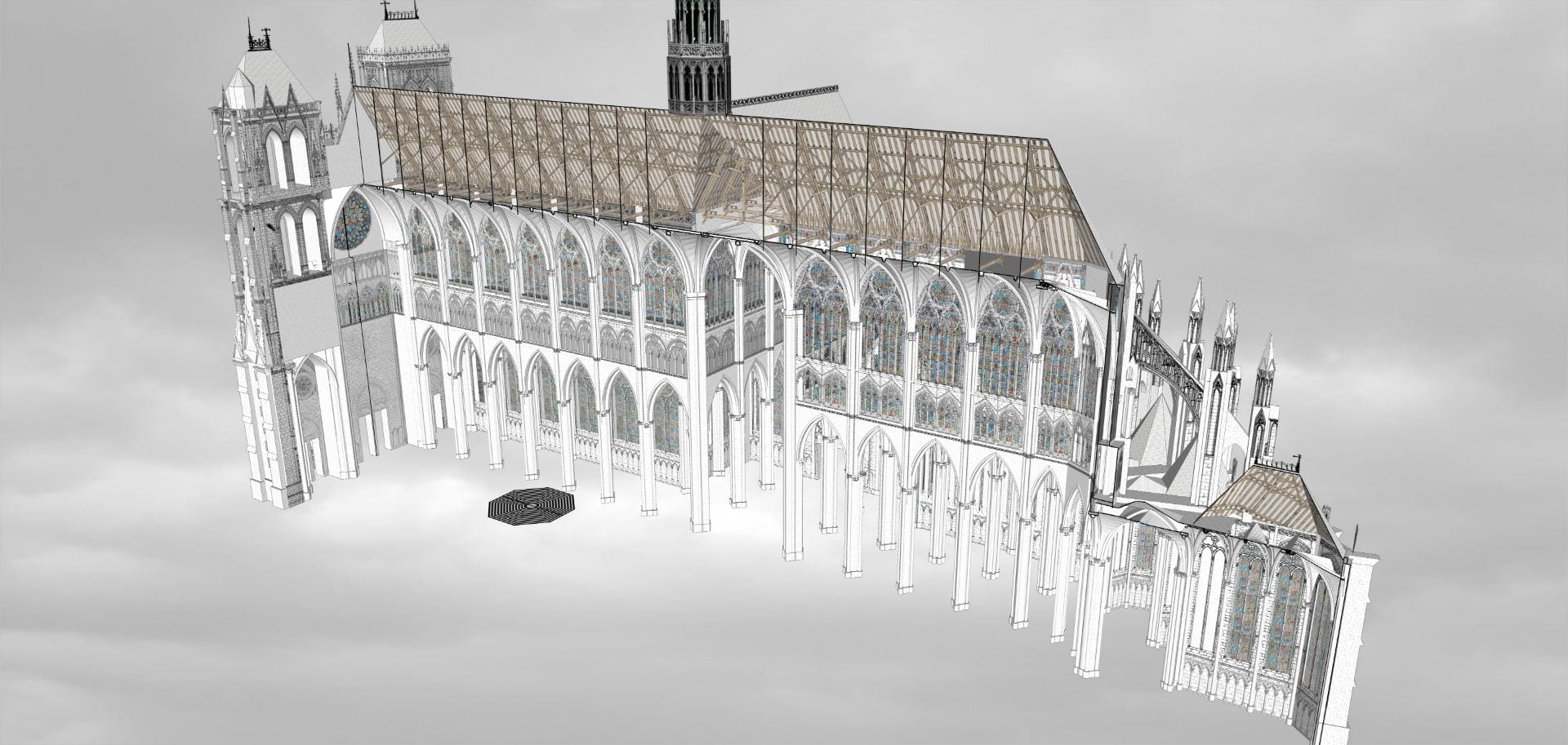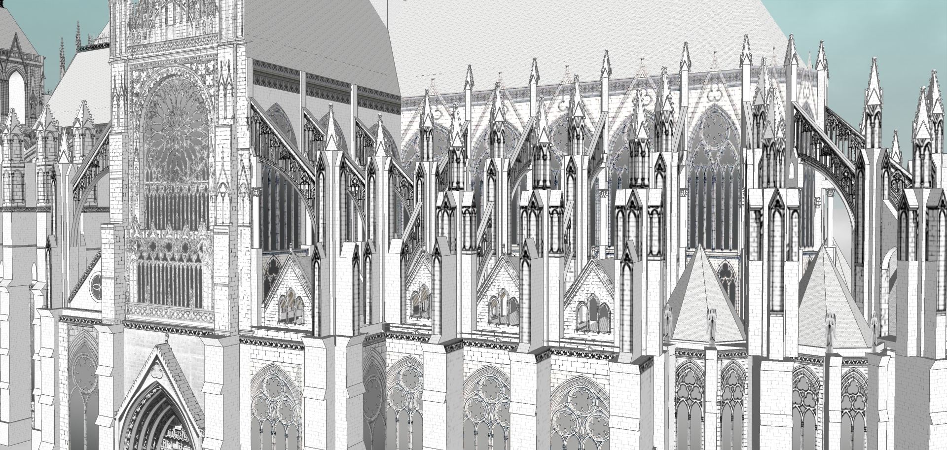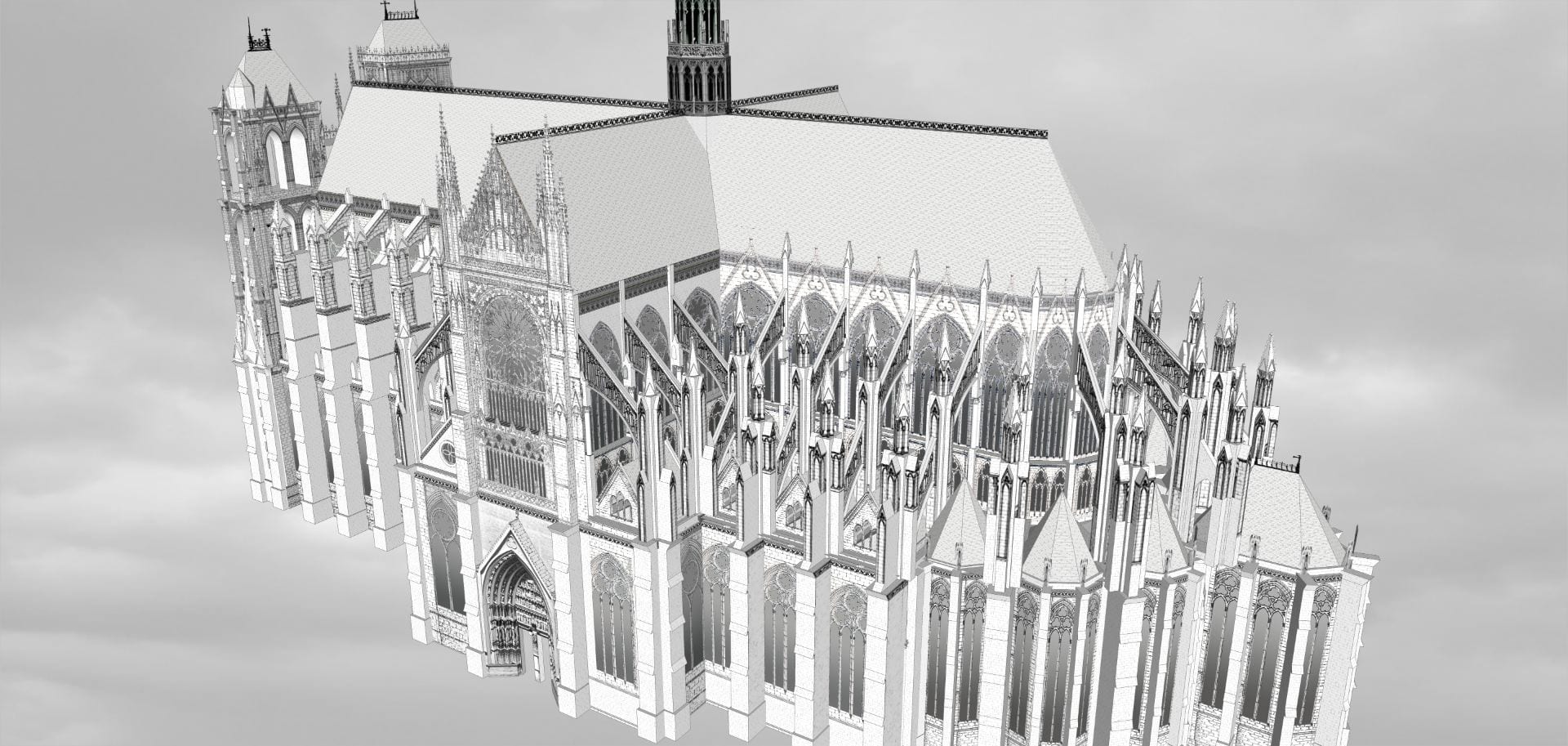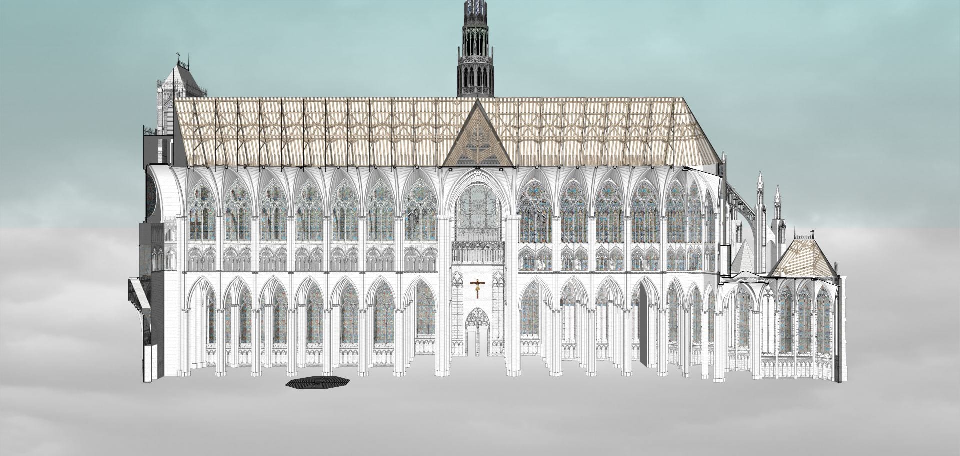 Computer models allow us to explore architecture in ways not possible in reality. With Amiens floating in the sky, one looks up to the grid of vaults and the forest of columns. The cathedral is real, but the views of it are imaginary.