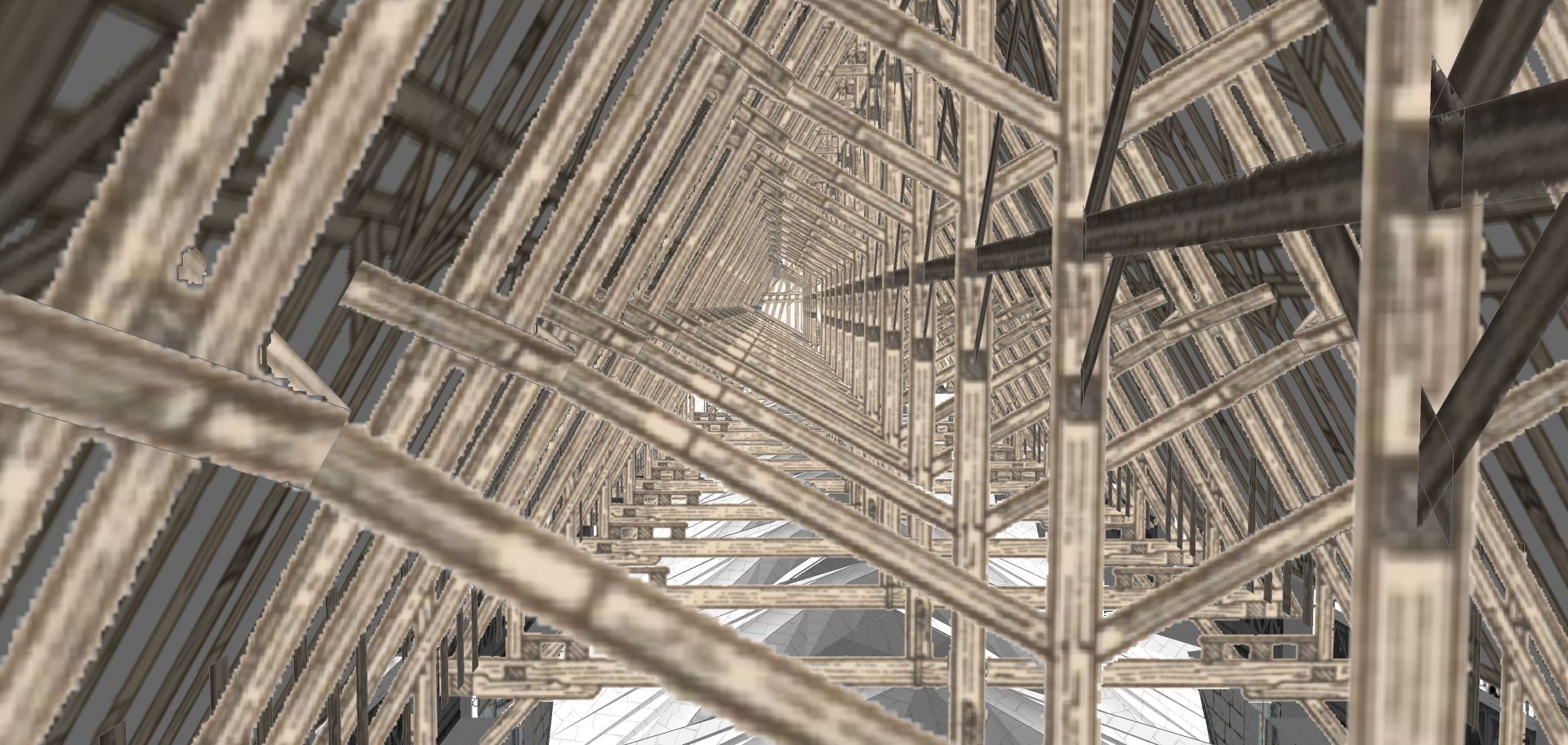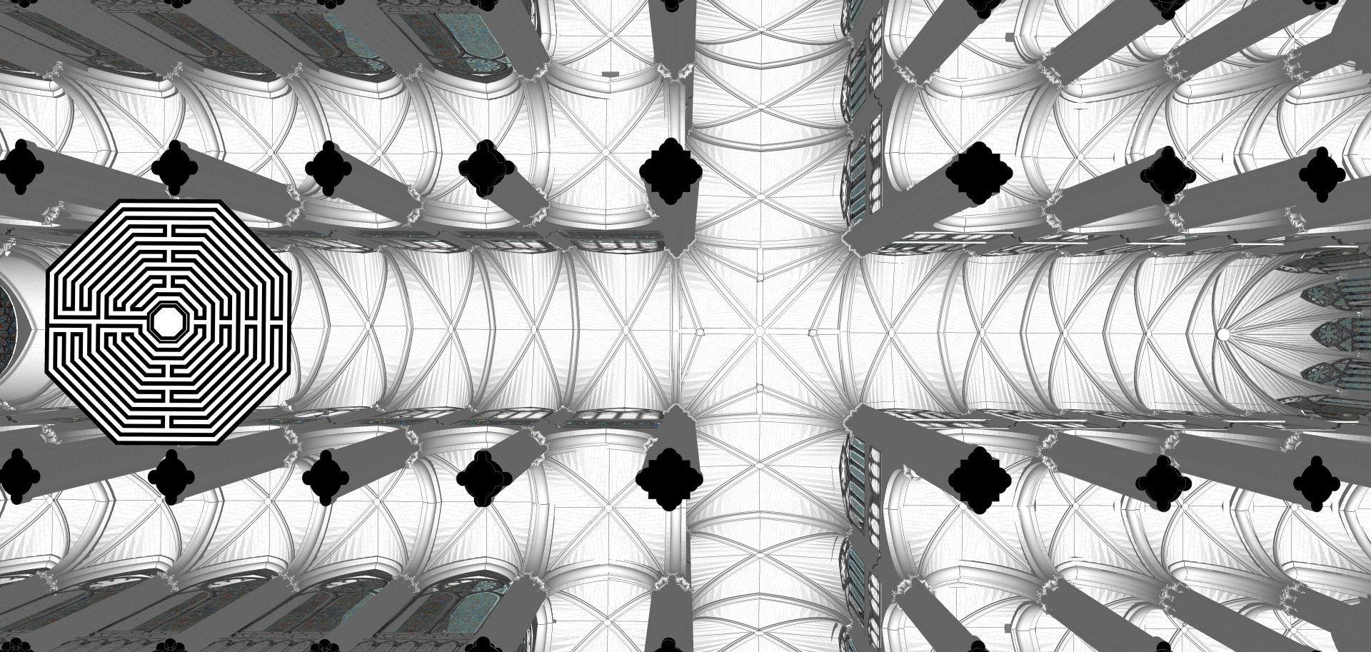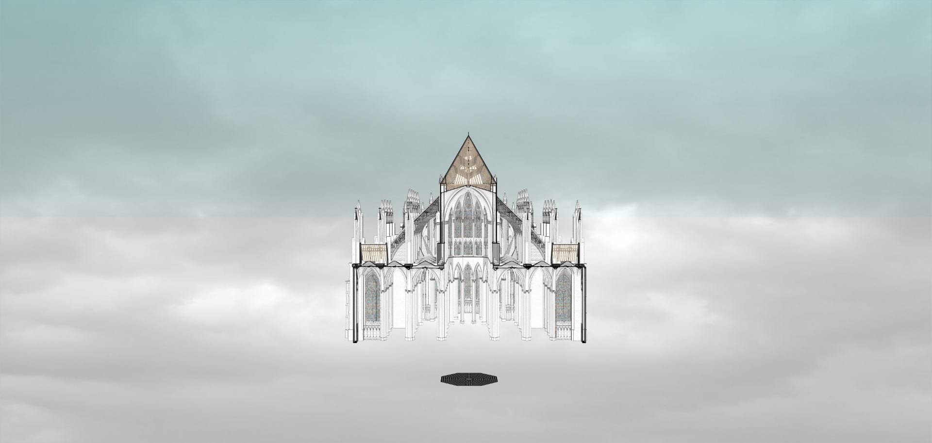 Viewers approach Amiens from the west, like medieval pilgrims did. Viewers then move through the complex system of flying buttresses that support the cathedral vaults. The animation then reconstructs the dynamic geometry that engineers encoded in the cathedral floor plan. The film closes with the view from below the foundations, as if the cathedral were floating on air.