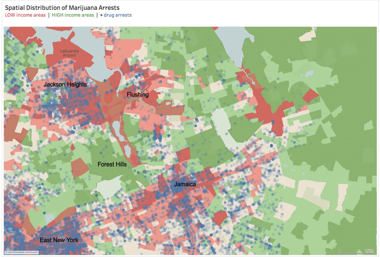 Queens. Red (i.e. low-income) areas without arrests is due not to lax law-enforcement but to the lower population density of these areas.