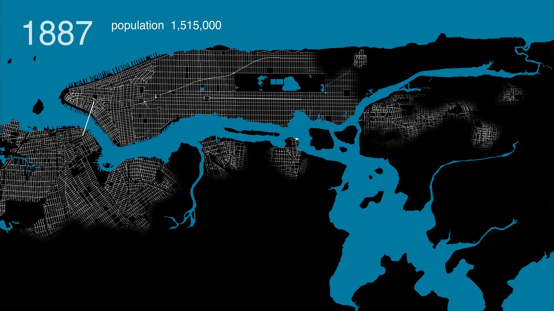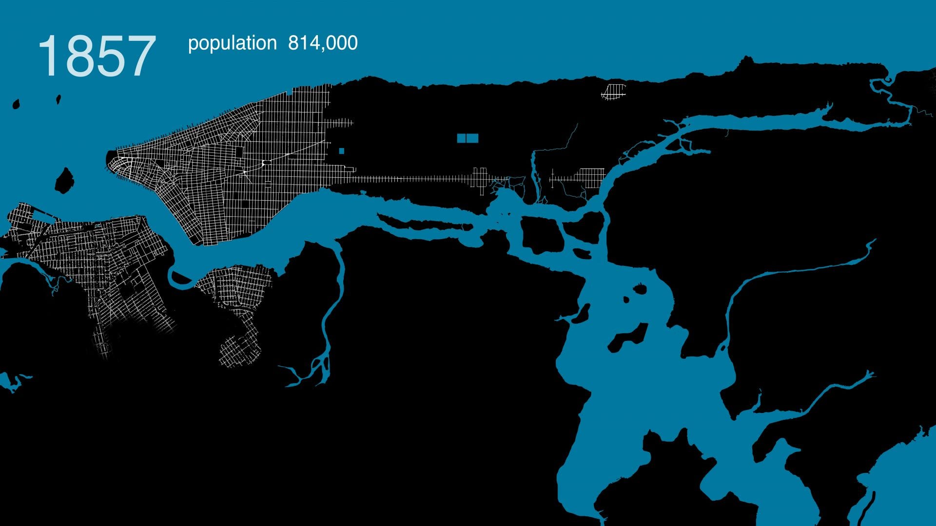 Several hundred maps in the digital archives of the New York Public Library and Library of Congress were analyzed to assemble this film. About 25 of these maps were then selected, downloaded, merged, stretched, and warped in a single document to align with each other. This provided a consistent scale and allowed easier comparison of differences between maps of different date. As the source files were all in different colors, scales, and designs, we created a single base map with unified graphics. The redrawing not only permits correcting errors in less accurate old maps but also provides a graphic representation that is consistent over time. This coherence allows the rate and trends in urban growth to be read more easily and compared between eras.