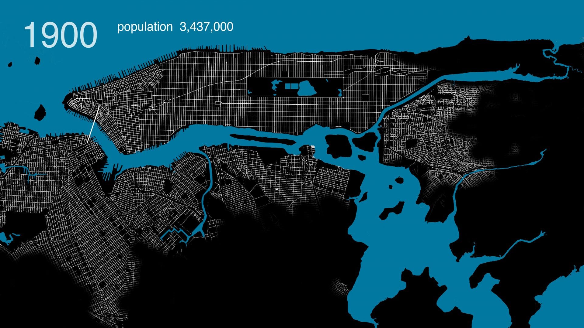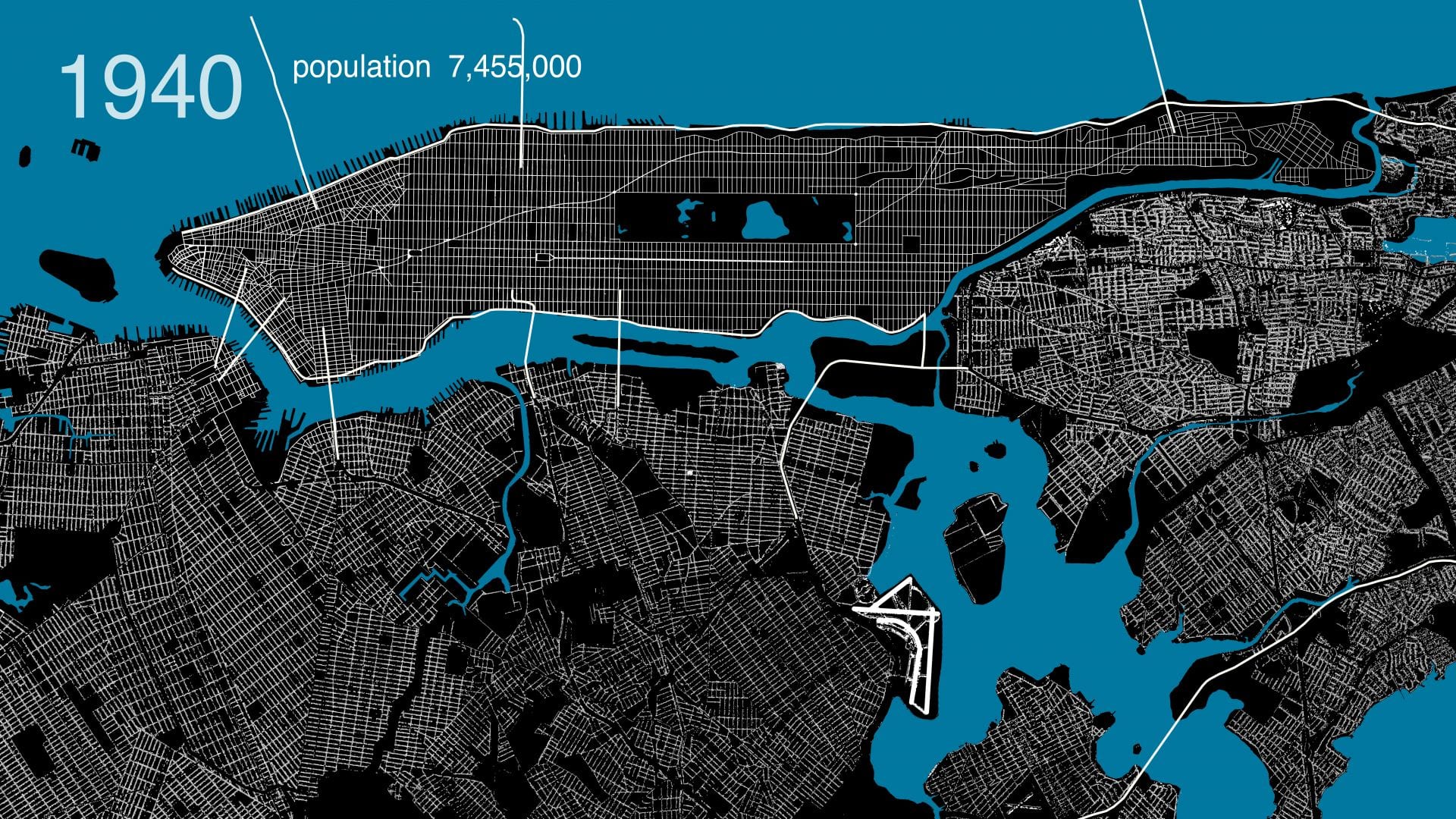 Here Grows New York visually animates the development of this city’s street grid and environment from 1609 to the present day, using geo-referenced road network data, historic maps, and geological surveys. The resulting short film presents a series of “cartographic snapshots” of the built-up environment at intervals of every 20 to 30 years in history. This process highlights the organic spurts of growth and movement that typify New York’s and most cities’ development through time. The result is an abstract representation of urbanism.