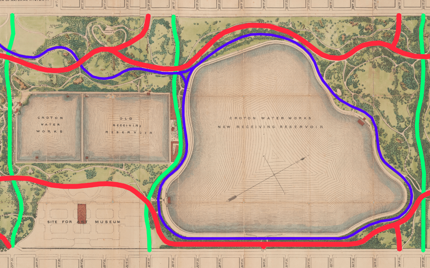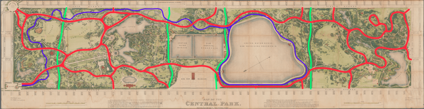 “Map of the Central Park” New York Public Library Digital Collections, 1873, modified by author with blue, red, and green color-coding.