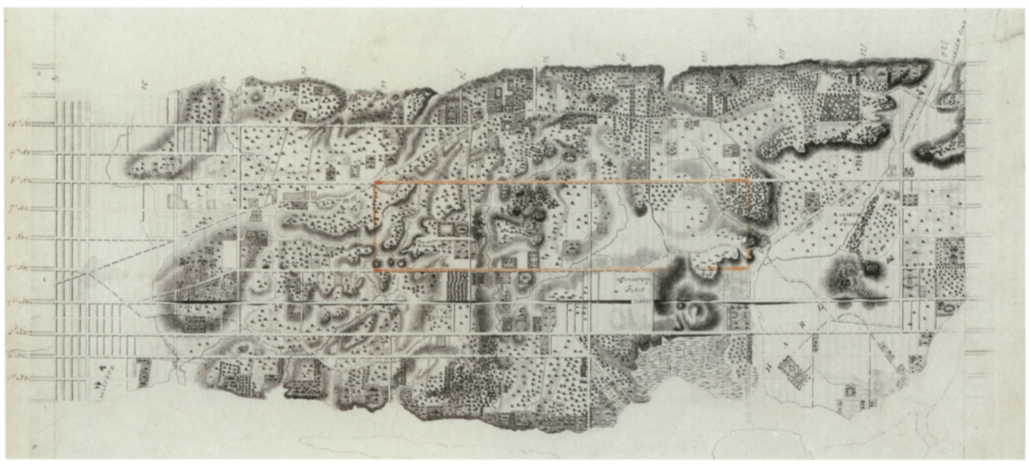 Figure 5. A c.1836 engraved map of mid-Manhattan with the outline of the future park drawn in orange ink c.1858. The incongruity between the park’s outline and the topography is also illustrated by the fact that the park’s northern boundary (originally at 106th street) would require blasting through a one hundred foot high solid-rock mountain to make way for the perimeter street.