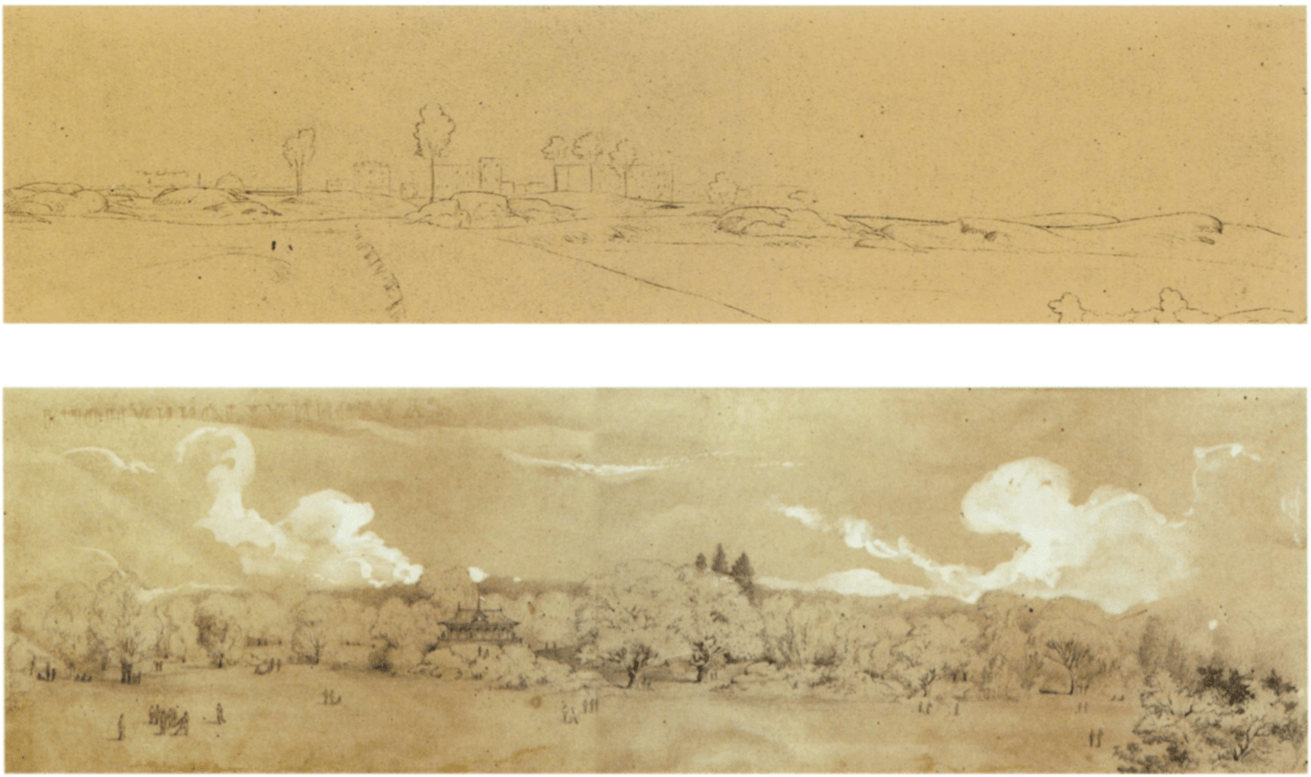 Figure 3. Frederick Law Olmsted’s 1857 drawing of the park before and after the planned “improvements.” The style and content of this image evokes the work of English landscape architects and Humphry Repton.