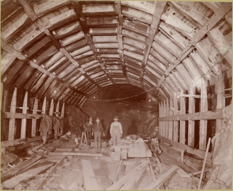 Figure 17. “Central Park Tunnel.” Miners carve a future subway tunnel under the park in 1902.Figure 18. “Men standing on Willowdell Arch.” The chief engineers and architects pose for an 1862 photo above one of the park’s signature tunnels.