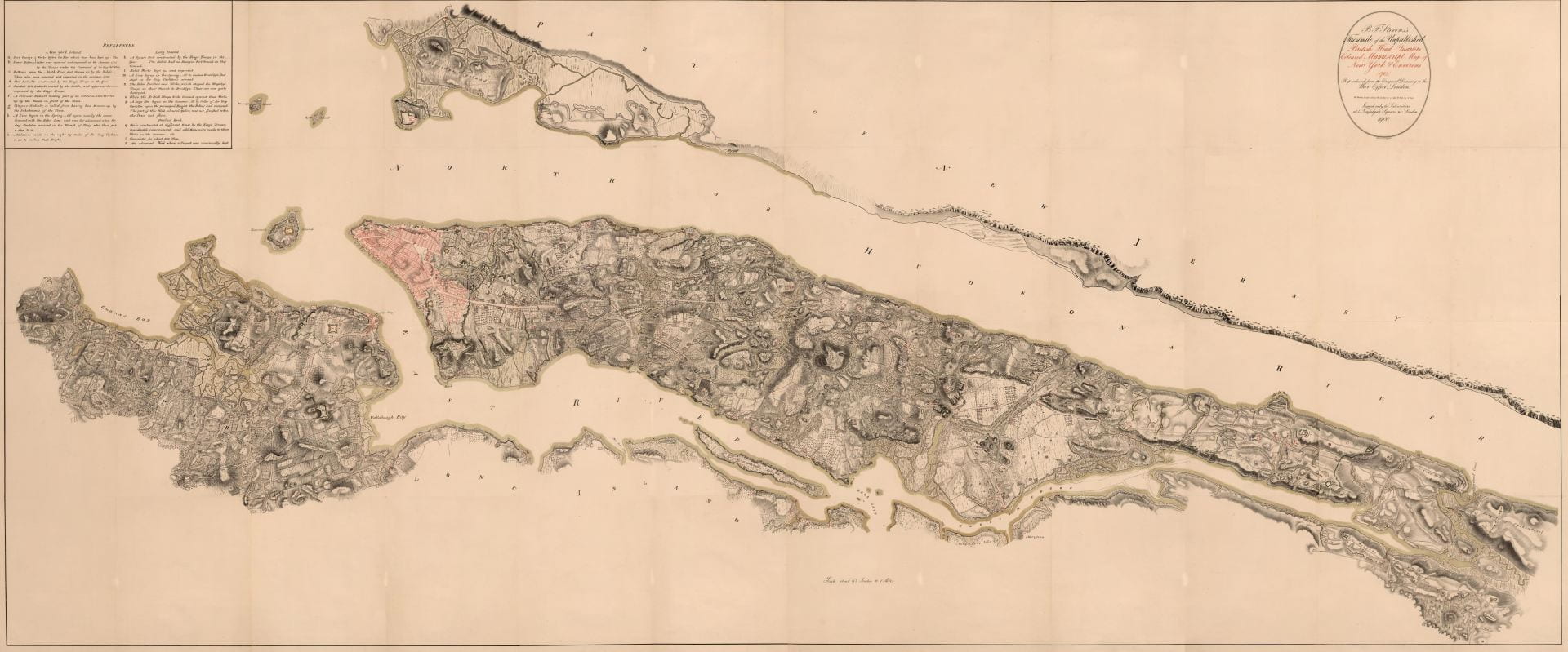 Figure 4. British Headquarters Mapof Manhattan Island from c.1789. Only the shaded pink section at top of island is developed at city-level density. The rest consists of rolling hills, forest, and farmland that inspired Henry Hudson, the first European who “discovered” the island in 1609, to remark that: “The land is the finest for cultivation that I ever in my life set foot upon.”11