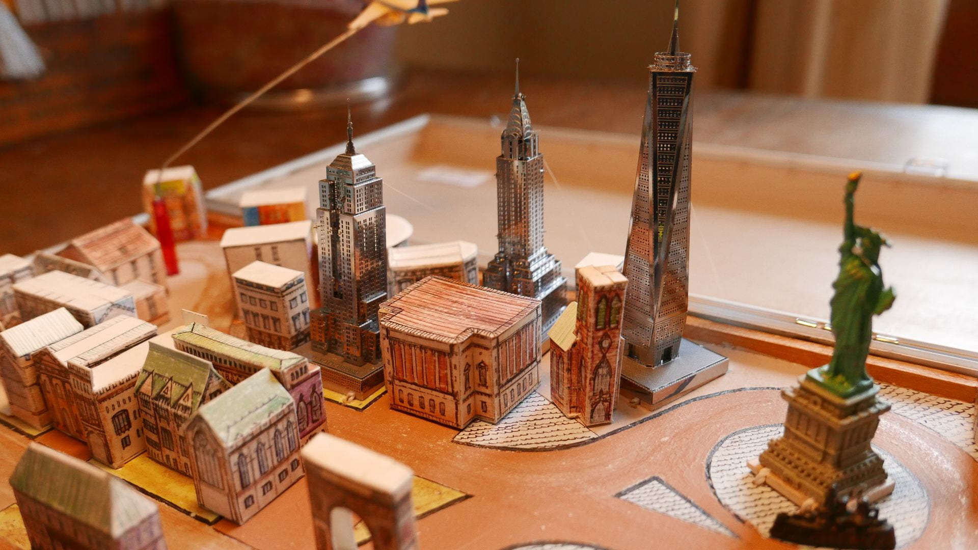 Inspired by the Stettheimer Dollhouse at the Museum of the City of New York, this pop up model in a recycled metal box (measuring 8 inches wide by 15.5 long and 2.5 deep) reveals a miniature world of New York City architecture and landmarks within. About 30 buildings made from hand cut paper and tin are spread across a flat ground of painted streets. Each building is made from a single sheet of paper that is cut and folded like origami to create different shapes and sizes. A hand cranked lever operates a mechanism of chains and gears hidden beneath the paper surface of the city streets. These gears move the magnetized trains and airplanes through the city.