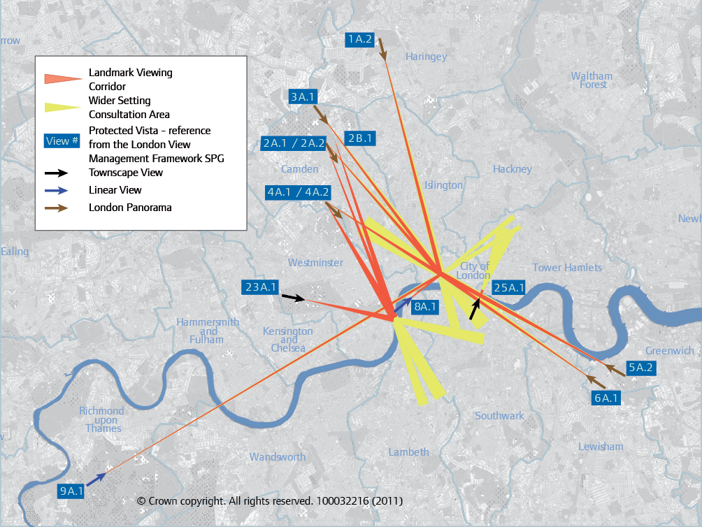 Protected vistas radiating out from Westminster and St. Paul’s. The cathedral architecture becomes, in equal parts, the symbolic, physical, and cartographic center of urban life, as if the red lines on these maps were arrows directing our gaze to the center of power.