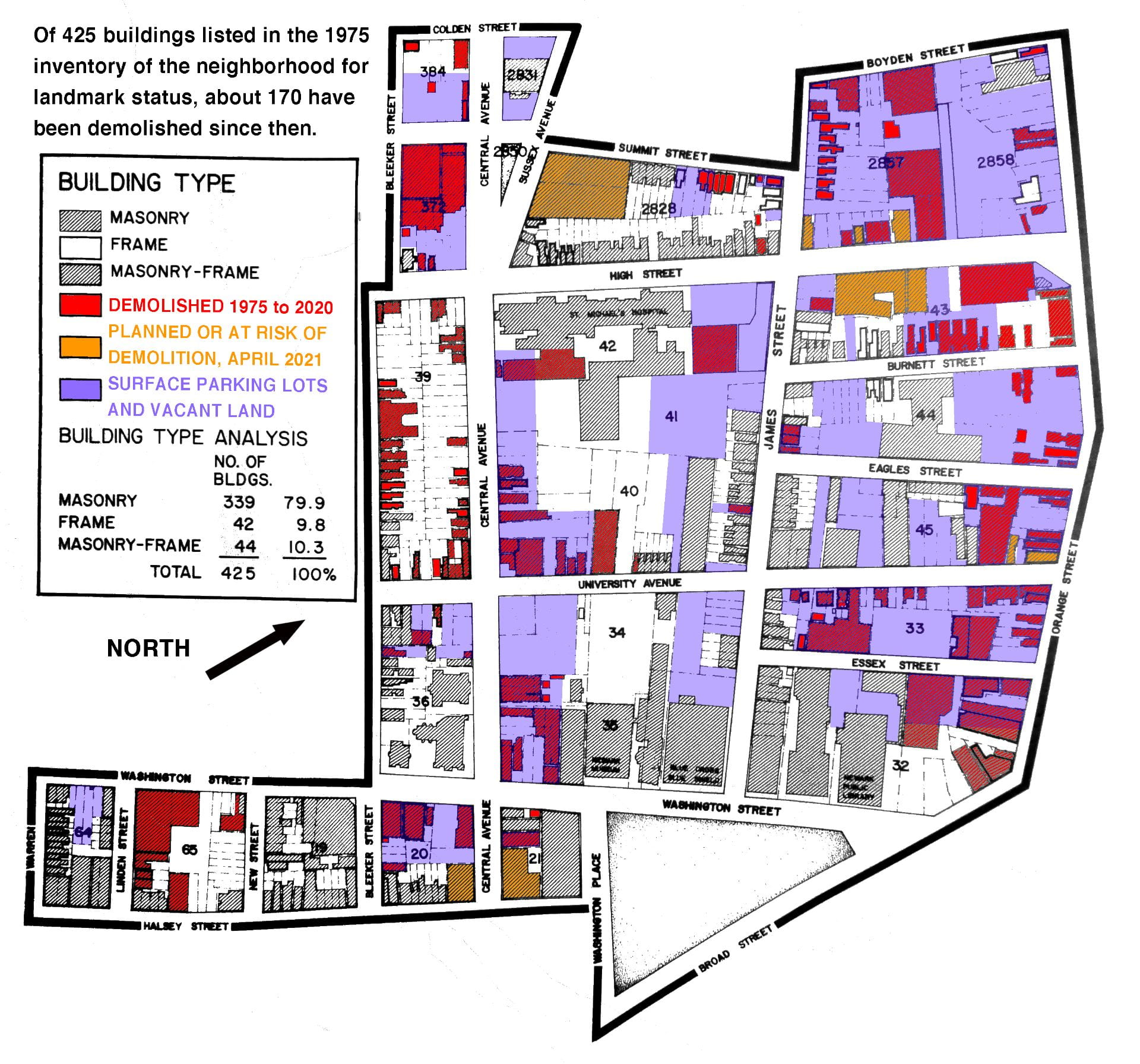 However, beyond its fortified campus carved out during the 1960s era of “urban renewal,” the university is now escalating its demolitions in the neighboring James Street Commons Historic District. Listed since 1978 on the National Register of Historic Places, this neighborhood is the city’s first historic district and contains some of Newark’s most significant historic assets. The spending of millions of dollars on building demolitions is odd when NJIT faced a 35 million dollar budget deficit in the first half of 2021, and when other Newark institutions and developers are following an opposite path of historic preservation.