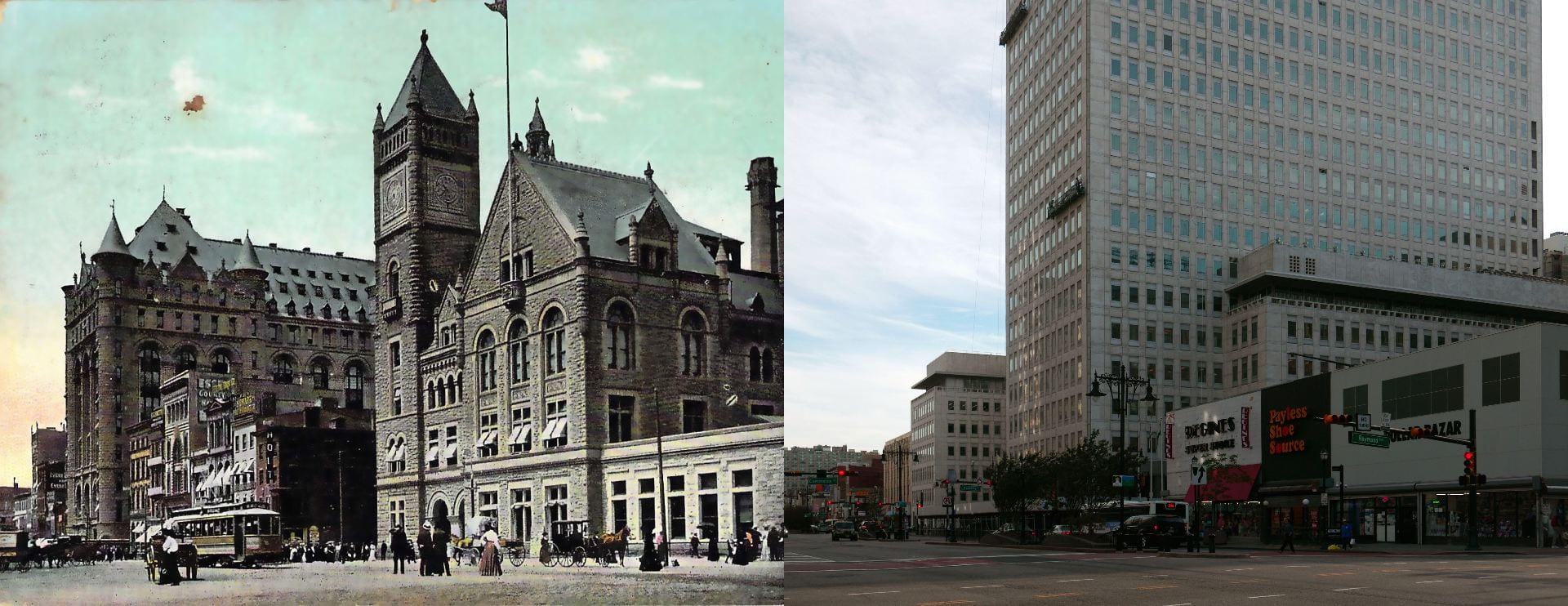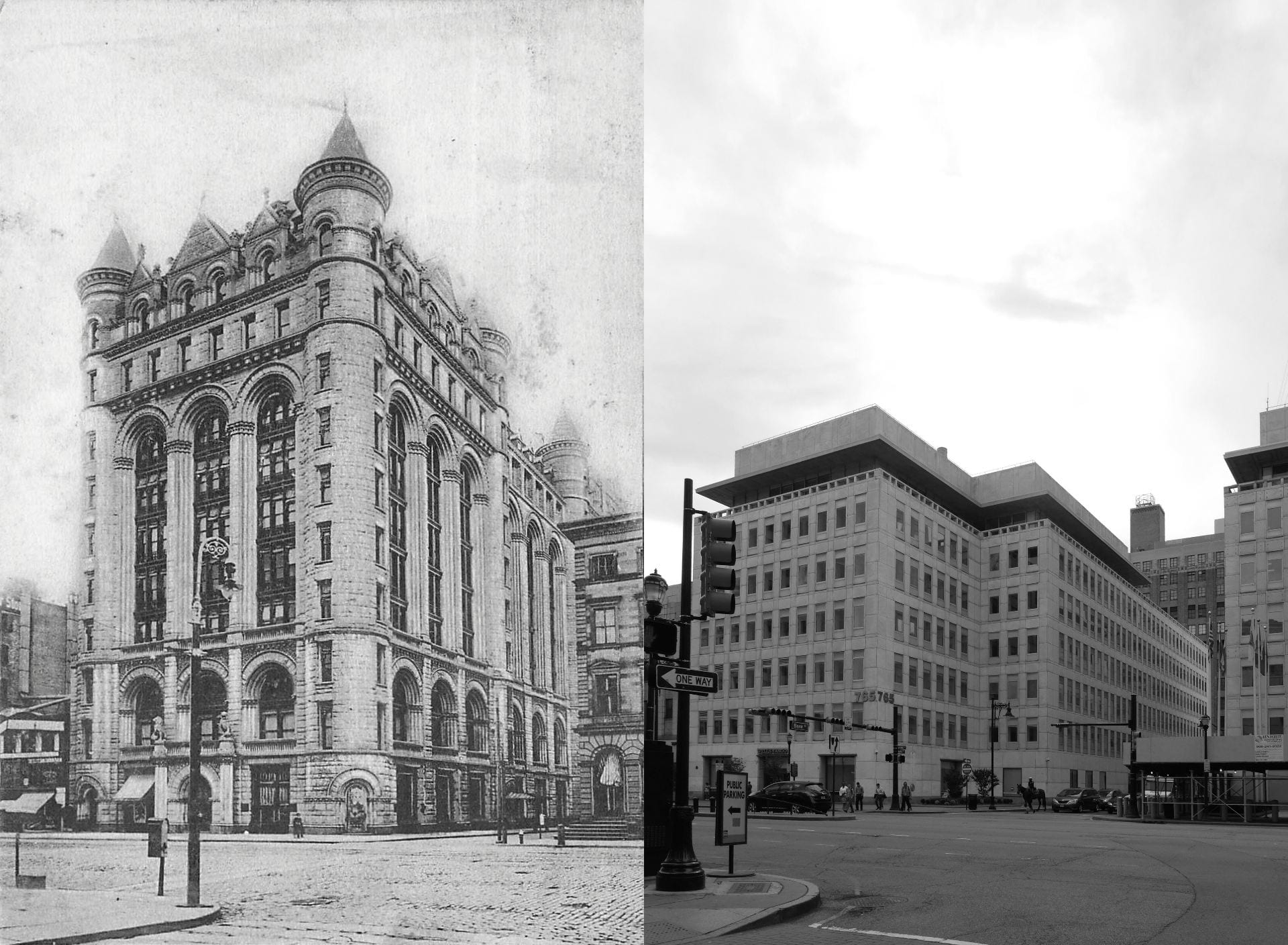 The Mutual Benefit Life Insurance Company building (left) and the Art Deco skyscraper that replaced it (right)