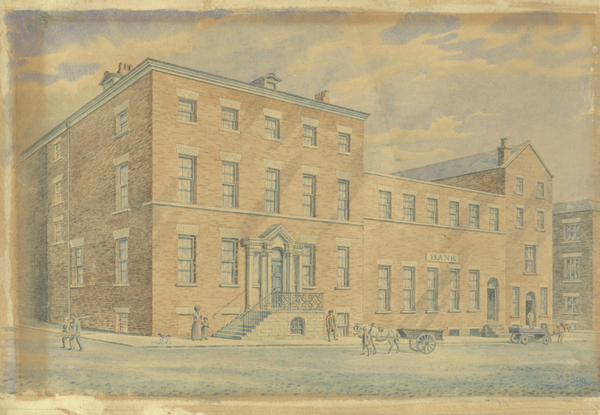 Watercolor of Leyland & Bullins bank on York Street in Liverpool in 1807. Bank offices at right. Leyland’s family home at left. Warehouse for Caribbean rum, Irish oats, and slave trade goods in rear. This building survives today unchanged.4