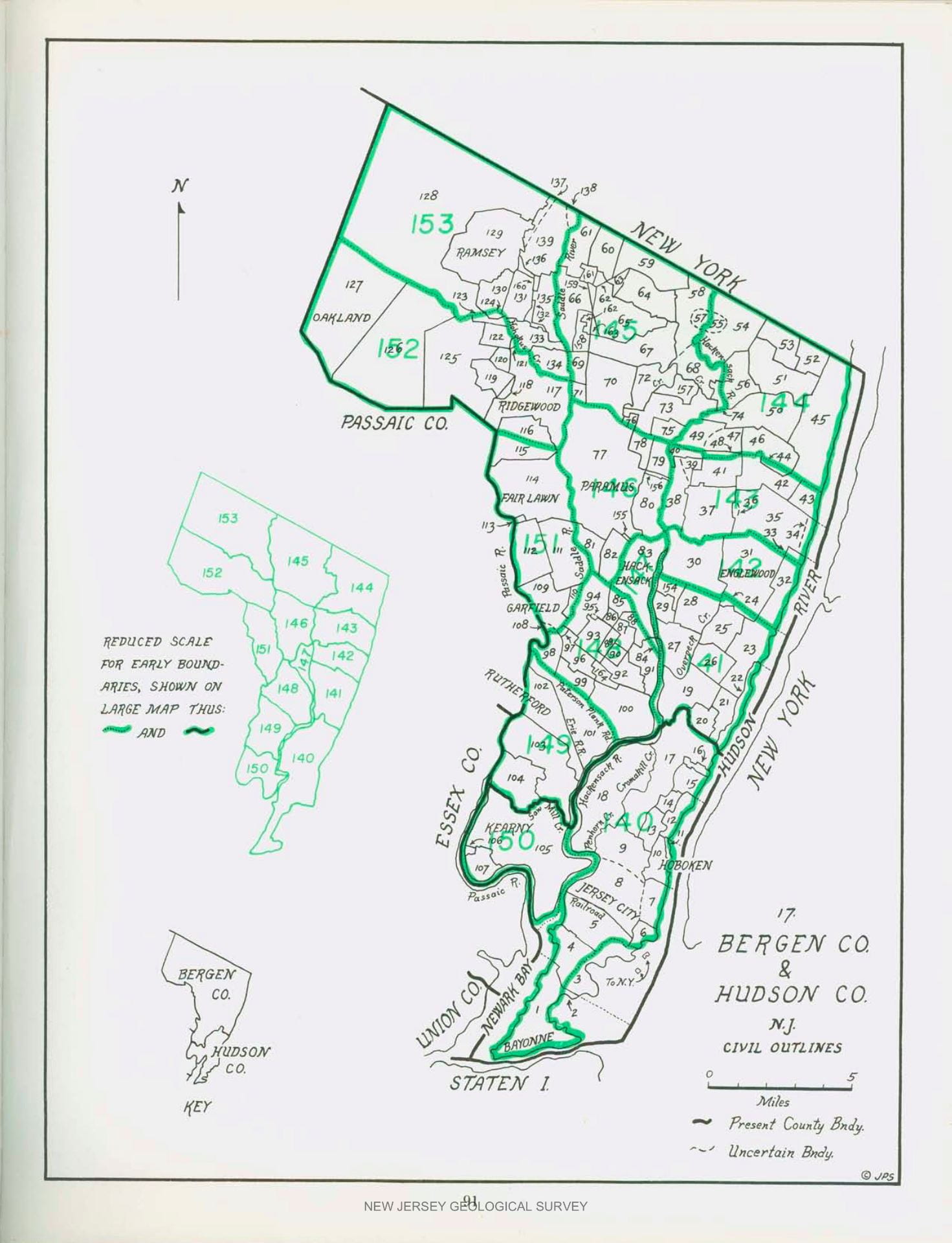 The county maps from John P. Snyder’s History of New Jersey’s Civil Boundaries are revealing. They illustrate the division of New Jersey into ever-smaller municipal units. The map below shows, for instance, the original vs. contemporary municipal boundaries in Hudson and Bergen County along the Hudson River. Colored in green are original boundaries vs. the present-day ones in black.
